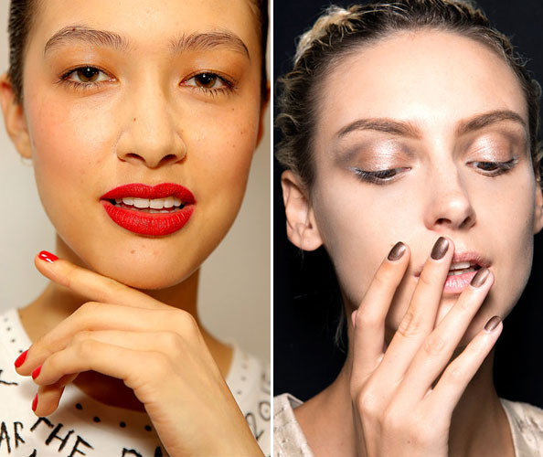 From deliberately glam lips and tips at Zac Posen to a similar (albeit softer) bronze twinset at Giorgio Armani, doubling up was big on the catwalk. Many of the makeup looks coordinated not only with one another but also with a key shade in spring fashions. Hairstylist Kevin Ryan, for example, used leftover trim from all the cobalt pieces in the collection for hair ties that synched with equally bold blue nails at Reed Krakoff (below). For a similar look, wrap colored leather trim from a crafts store (try M&J Trimming s stitched leather cord $7/yard; mjtrim.com), around a ponytail loop. Knot it tight, and resist any impulse to tie a bow. You don t want it to look too precious, says Ryan.